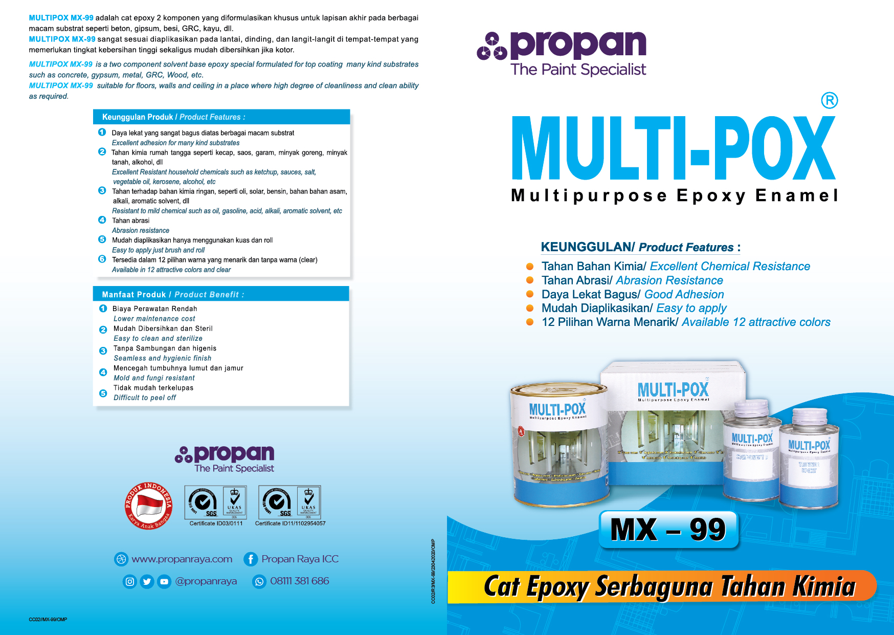 MULTIPOX MX-99 adalah cat epoxy 2 komponen yang diformulasikan khusus untuk lapisan akhir pada berbagai macam subtrat seperti beton, gipsum, besi, GRC, kayu, dll.